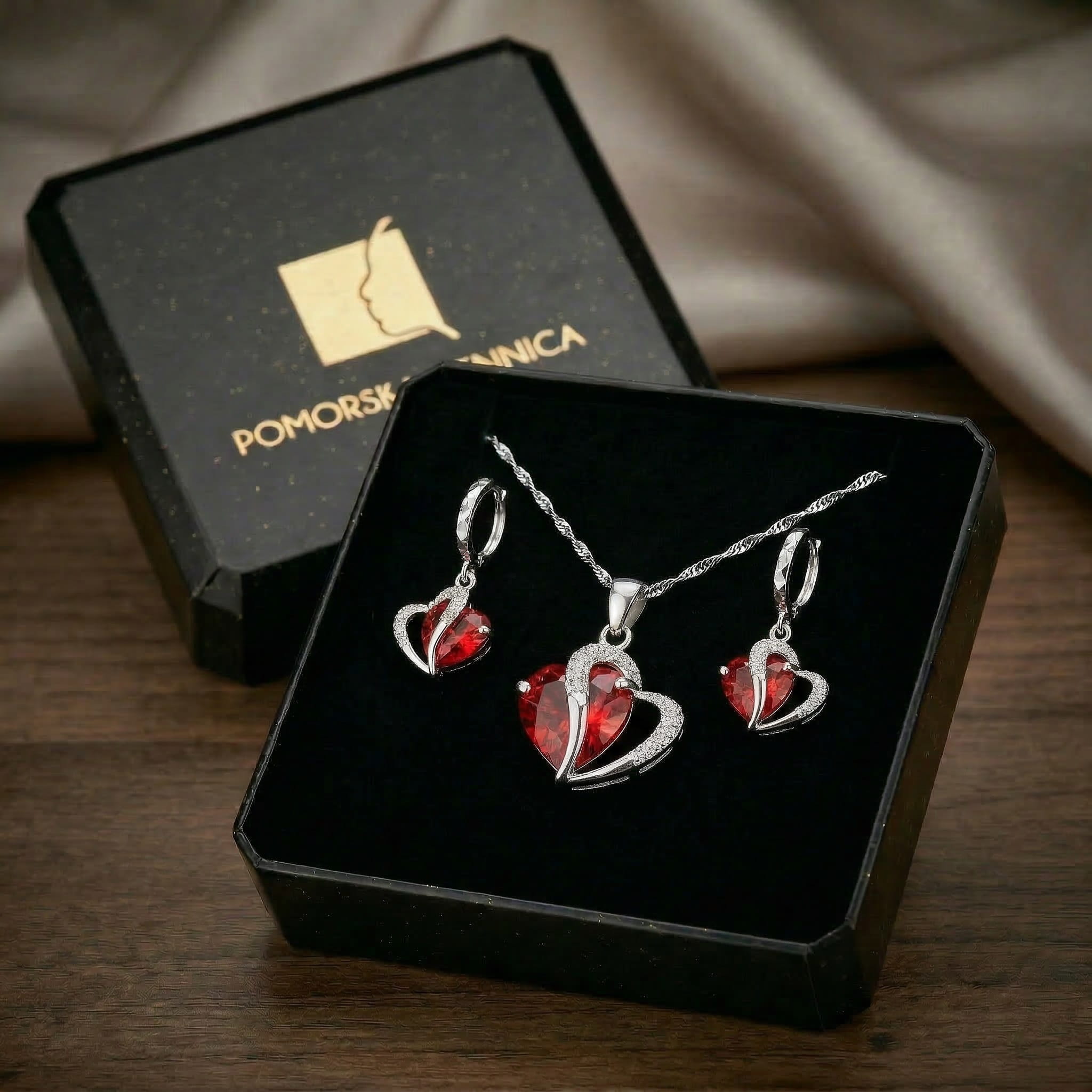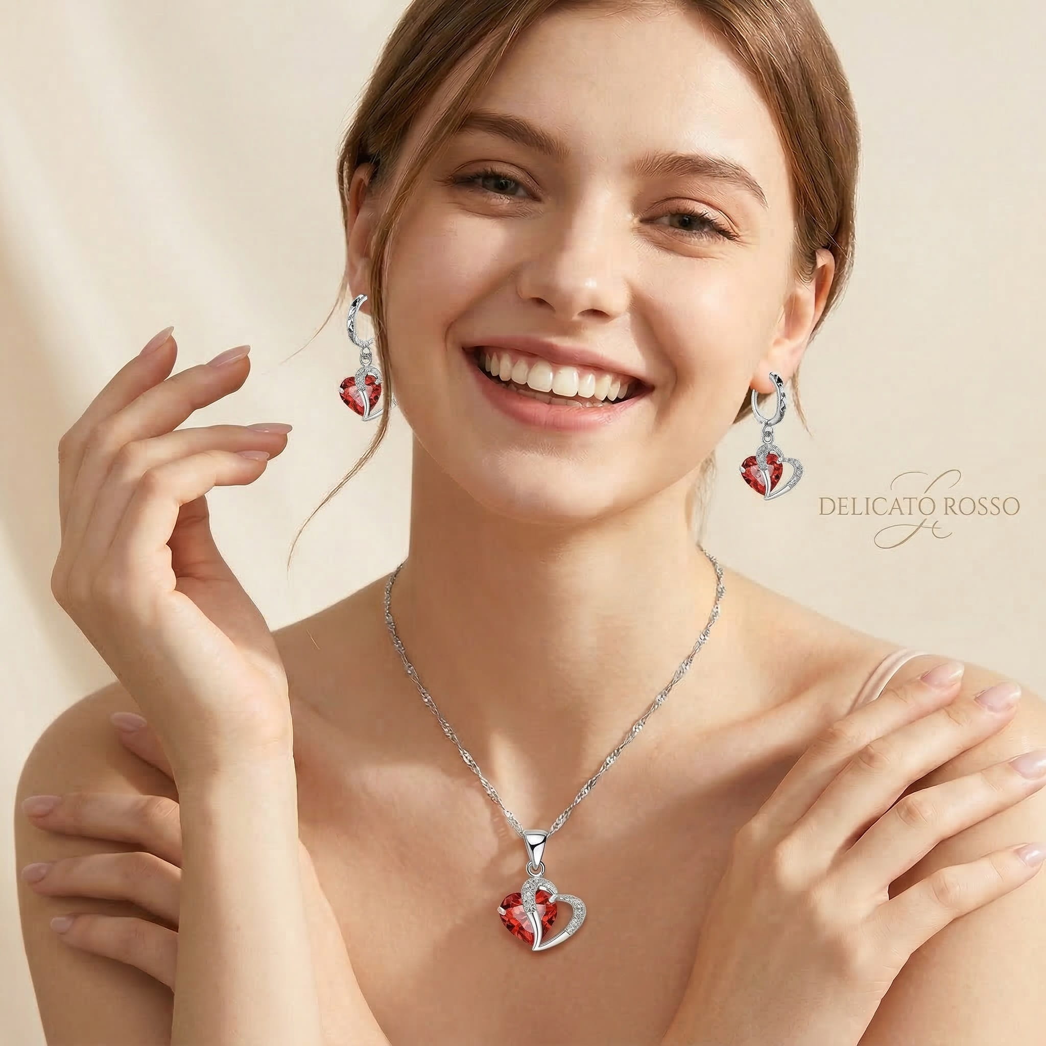 Zestaw „Delicato Rosso” – Naszyjnik i Kolczyki ze Srebra 925, Podwójne Serce w Rubinowej Czerwieni i Srebrze