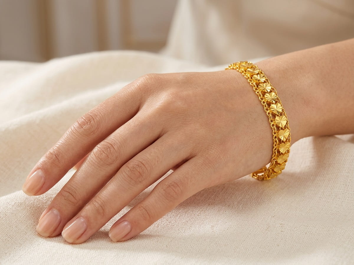 Blask wielowarstwowy – fasety na sercach + ogniwa rolo + powłoka 24k — złoto odbijające światło na trzech różnych poziomach jednocześnie