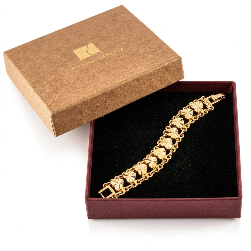 Bransoletka Oro to prezent dla kobiety, która lubi złoto naprawdę — nie pozornie, nie przyŁąpnie — lecz z przekonaniem i dumą. Urodziny, rocznica ślubu, Boże Narodzenie, Walentynki, bankiet — albo po prostu: bo zasługuje na coś ciężkiego. 19,23 gramowe srebrno-złote arcydzieło na 18 cm nadgarstku — zapakowane w firmowe pudełko jubilerskie. Pokłon dla złota. Pokłon dla niej.