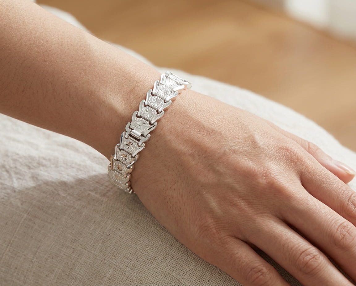 Między kwadratowymi ogniwami gwiezdnymi biegną wąskie, ukośne listewki metalowe o pełnym polerze — gladkie, lustrzane, odbijające środowisko jak małe lustra. Te skosowe łączniki mają podwójną funkcję: jubilerską — łączą ogniwa i zapewniają elastyczność bransoletki — i estetyczną — tworzą rytmiczny wzorzec błys-ku między matowo-gwiezdnymi ogniwami. Kontrast między teksturownym kwadratem a lustrzanym skosem jest architektonicznym zabiegiem jubilerskim: dwie powierzchnie, dwa charaktery światła, jedno nierozerwalnie spójne widowisko.
