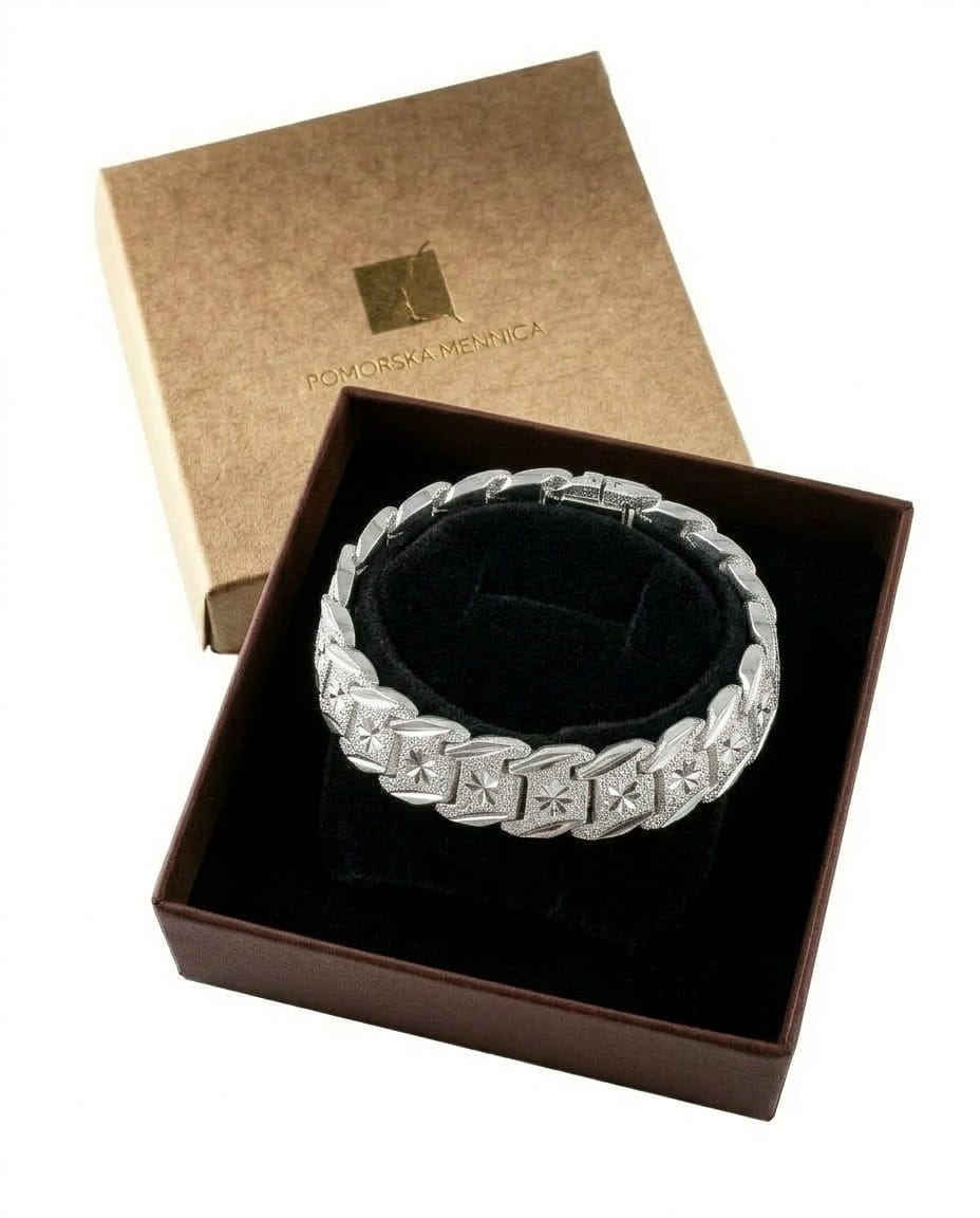 Bransoletka Vitrum to 20 centymetrów srebra 925 z próbą, rodowanego platynowym metalem, z rzędem kwadratowych ogniw grawerowanych gwiezdnym wzorem diamentowym ostrzem, przeplatanym lustrzanymi skosami błyszczącymi jak szkło — wszystko w 27,07 gramach, które się czuje przez cały dzień jak piękny, stały ciężar. Vitrum — bo srebro może świecić jak szkło. Noś srebro. Noś gwiazdy. Noś Vitrum.