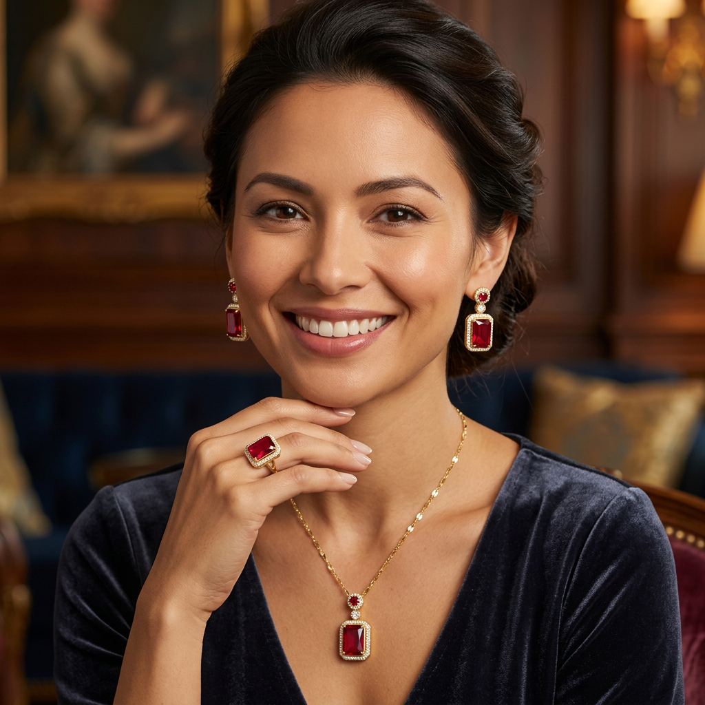Zestaw biżuteryjny — parure po francusku — to sztuka tw-orzenia spójnego języka wizualnego z wielu elementów. Parure były w XIX wieku wyznacznikiem statusu: posiadaczka pełnego zestawu była kobietą kompletnie ubraną. Zestaw Romantic daje tę spójność dostępnie i bez kompromisów w jakości wzornictwa: wielkie czerwone kamienie, złote oprawy, migoczące halo — od ucha przez szyję do palca.