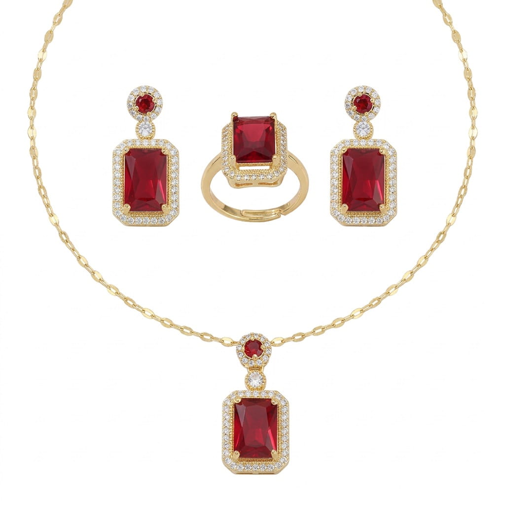 Zestaw Romantic to naszyjnik, kolczyki i pierścionek z dużymi czerwonymi cyrkonionami emerald cut w złotych oprawach z białym halo pavé — spójny komplet w kolorze rubinu i złota, od szyi przez uszy po palec — łącznie 12,60 g złoconego stopu miedzi bez niklu, zapakowany w firmowe pudełko jubilerskie. Romantic — bo historia miłosna zasługuje na więcej niż jeden gest. Noś rubin. Noś złoto. Noś Romantic.