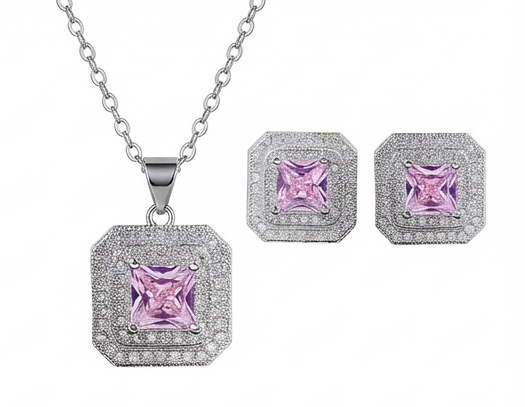 Zestaw Secreto to naszyjnik i kolczyki z różowo-fioletową cyrkoniq princess cut 14,13 × 14,13 mm w podwójnym halo białych cyrkonii pavé na rodowanym stopie miedzi — barwa różanego ametystu, geometria kwadratu, dwa koncentryczne kręgi blasku — na łańcuszku ankier 40+5 cm milczącym, bo zawieszka mówi wszystko. Secreto — bo najpiękniejsze rzeczy odkrywa się dopiero przy bliższym spojrzeniu. Noś fiolet. Noś róż. Noś Secreto.