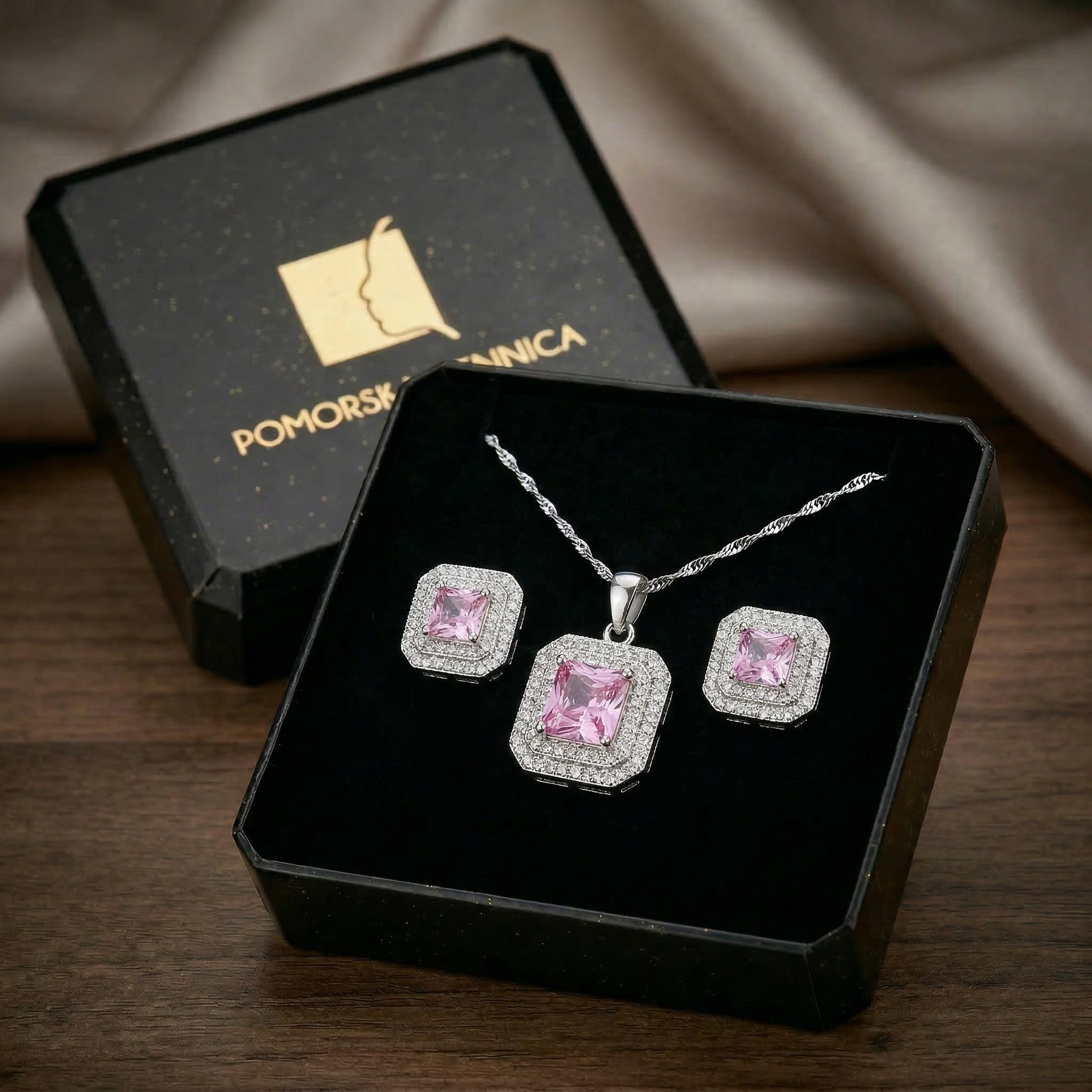 Zestaw Secreto to prezent dla kobiety, która nie nosi różu i nie nosi fioletu — nosi to, co między nimi. Dla tej, która chce biżuterii delikatnej i wyrazistej jednocześnie, nieoczywistej i eleganckiej. Urodziny, walentynki, rocznica — albo po prostu: bo ten kolor wygląda jak ona. Kolczyki i naszyjnik w jednym firmowym pudełku jubilerskim — gotowe do wręczenia i do założenia.