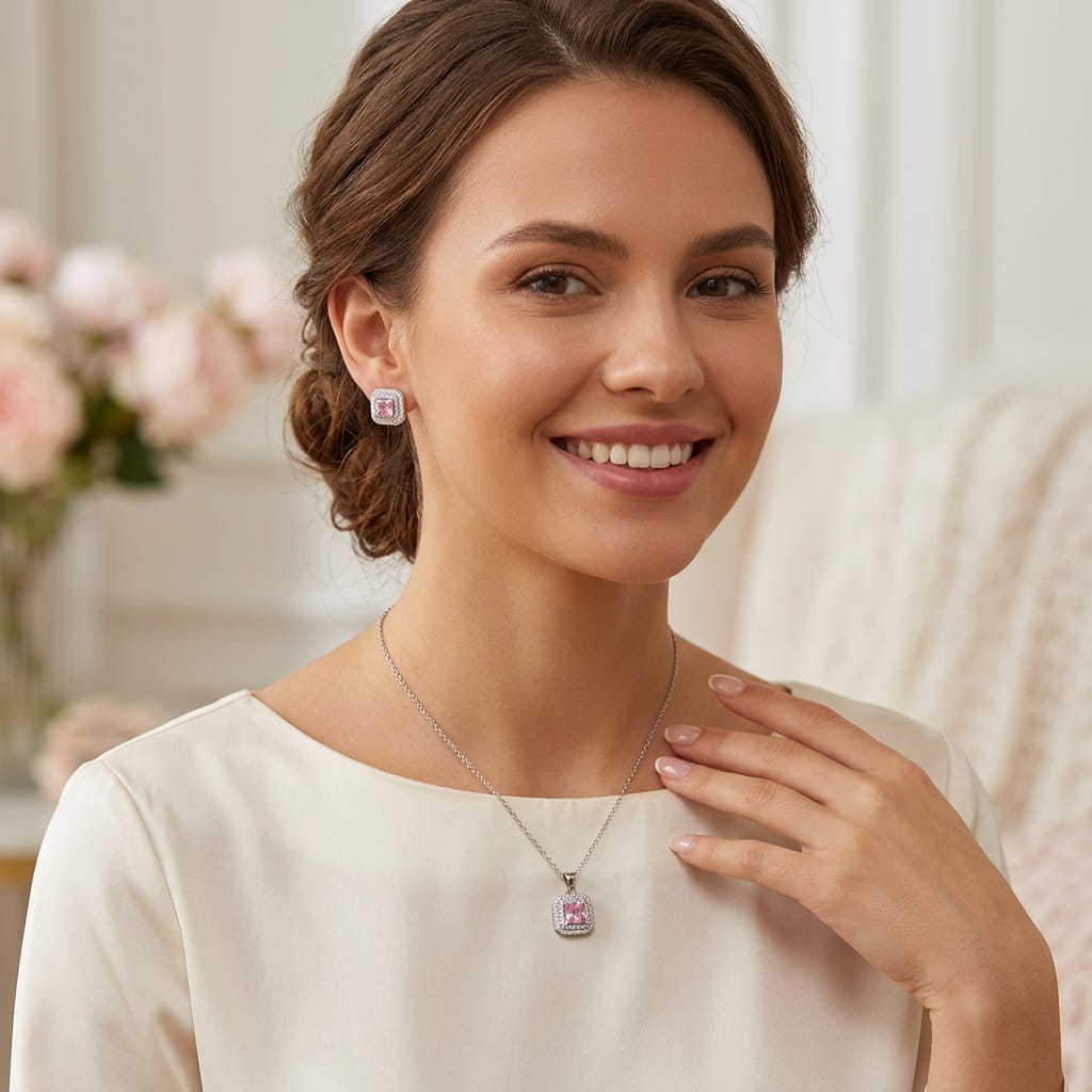 Secreto — po hiszpańsku i włosku: sekret. To, czego nie widać od razu. To, co się odkrywa stopniowo, przy bliższym spojrzeniu: różowo-fioletowy kamień w centrum — barwa między różem a amystem, między dniem a zmierzchem, nie jednoznaczna jak czerwień i nie oczywista jak błękit. Barwa dla tych, którzy lubią pytania zadawane biżuterią. Zestaw Secreto to naszyjnik i kolczyki ze zidentycznym motywem: kwadratowa cyrkonia w szlifie princess w kolorze różowego ametystu, oprawiona w podwójne halo białych cyrkonii pavé w rodowanym srebrze — delikatna i jednocześnie wyrazista. Tajemnica ma proporcje kwadratu: 14,13 × 14,13 mm.