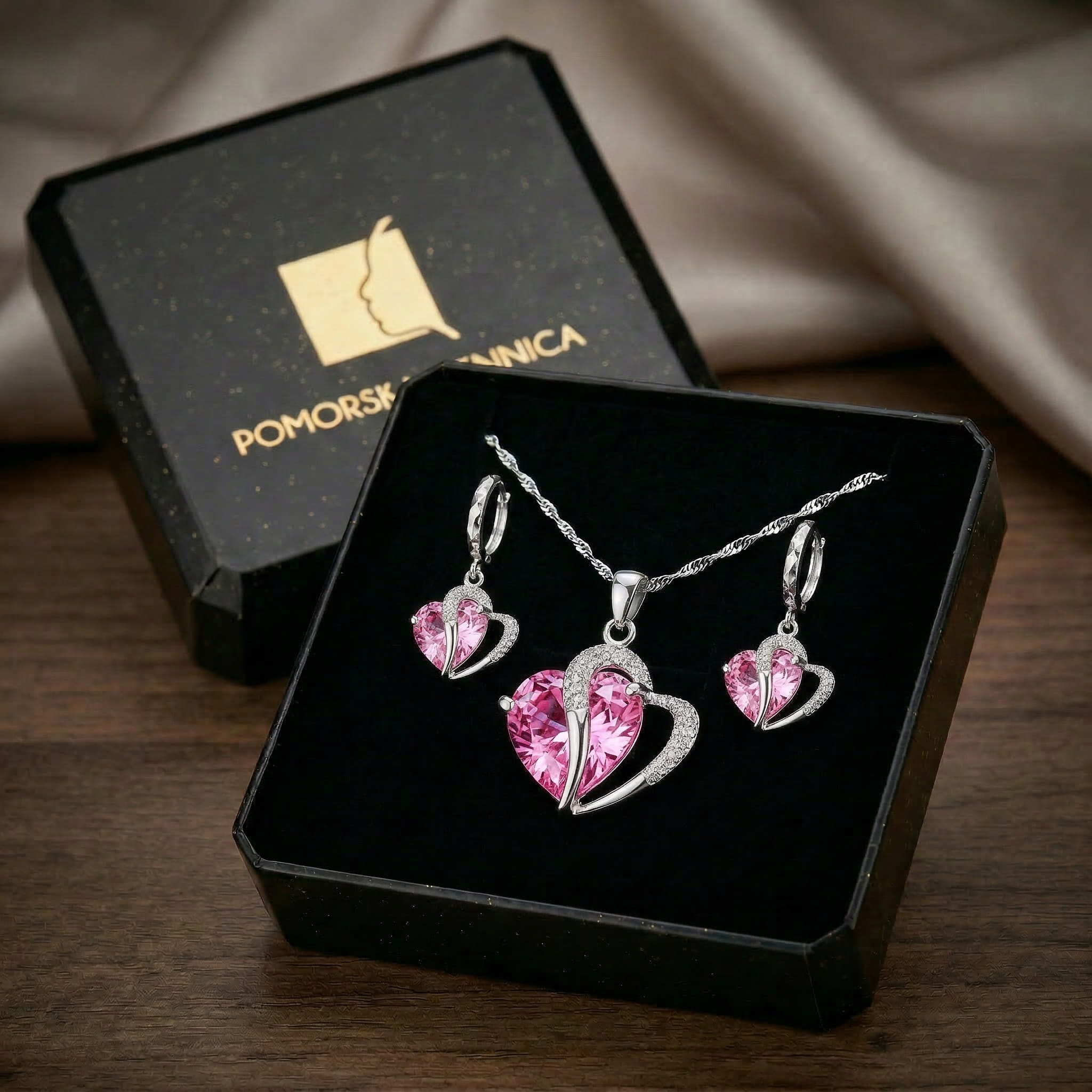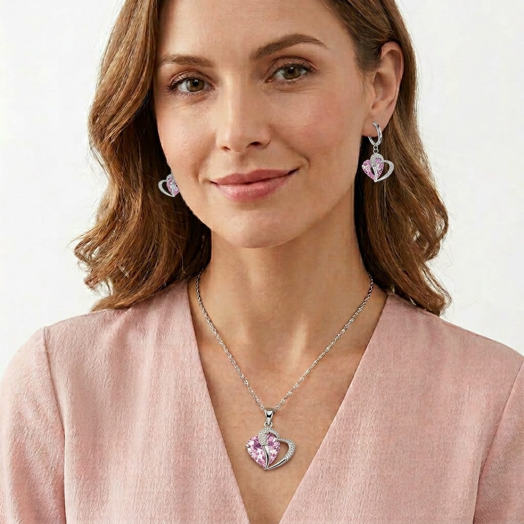 Zestaw Delicato Rosa to naszyjnik ze srebra 925 z wodna falą 42 cm i zawiszką — różowe serce heart cut 16,6 × 21 mm w srebrnym konturze pavé — i kolczyki huggie z diamentowanym ringiem 925 ze zwisającym różowym sercem 28 mm, razem 6,01 grama srebra próby 925 z wybita próbą, bez niklu, w jednym pudełku jubilerskim. Delicato Rosa — bo miłość delikatna trwa dłużej niż głośna. Noś róż. Noś srebro. Noś Delicato Rosa.