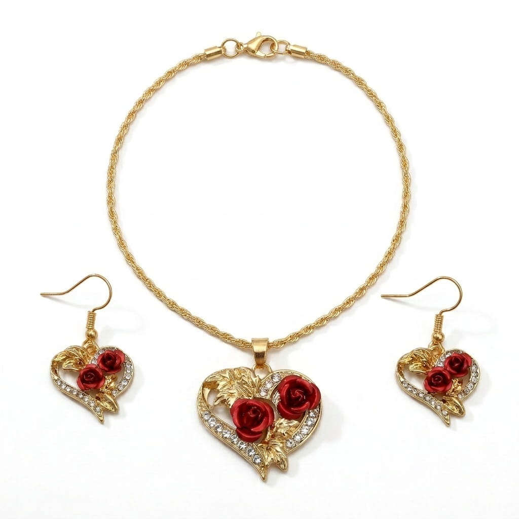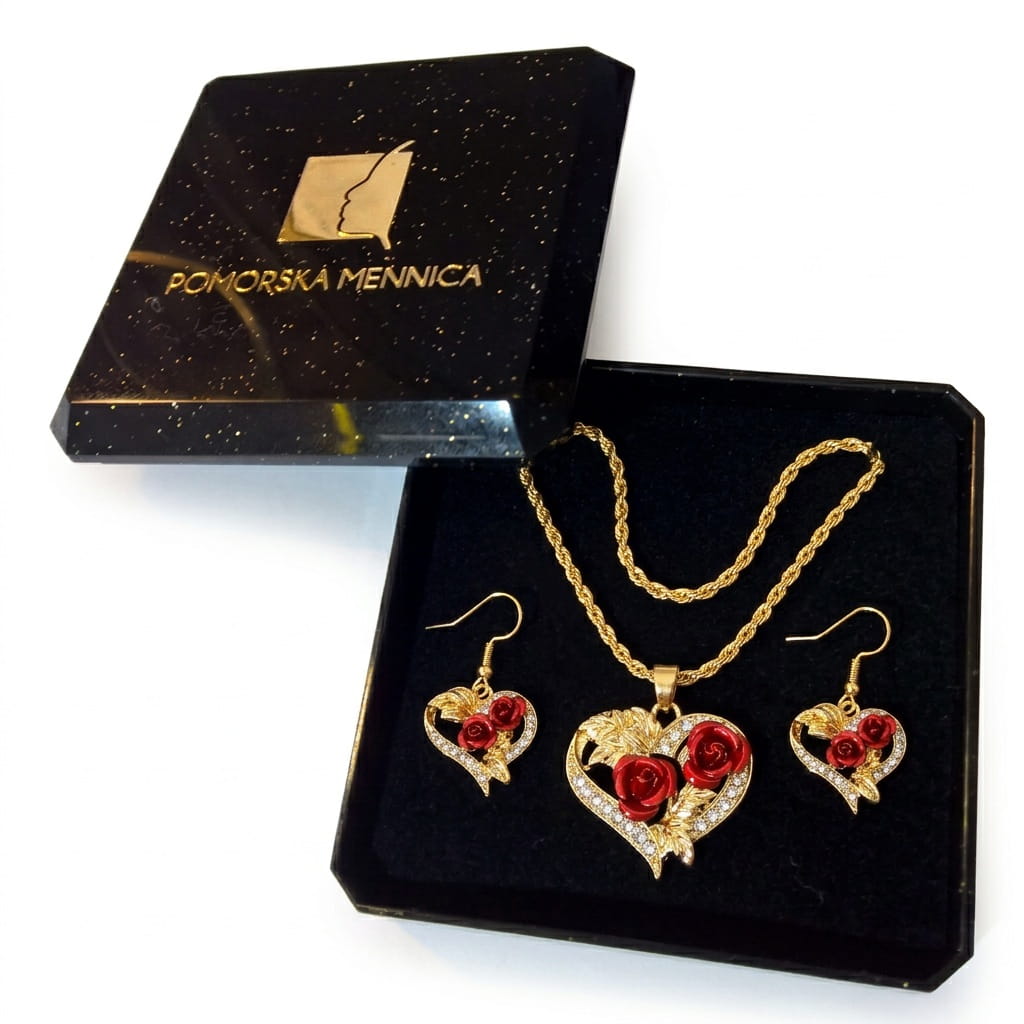 Zestaw „Elegante” – Naszyjnik i Kolczyki: Złote Serce z Czerwoną Różą i Listkami, Stop Cynku Złocony