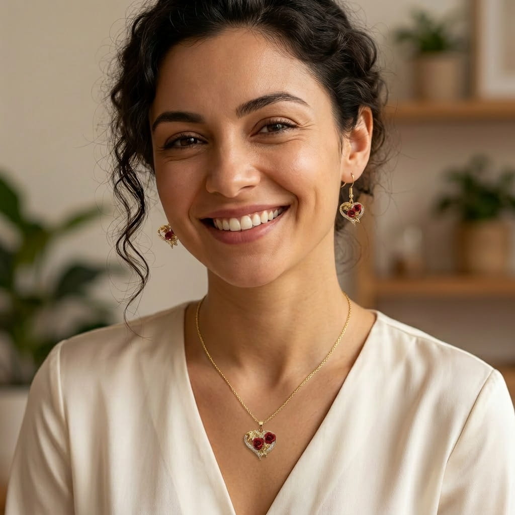 Zestaw Elegante to naszyjnik ze stopu cynku złoconego — zawieszka 27,75 × 25,86 mm: złote serce z trzema trójwymiarowymi czerwonymi różami, złotymi listkami i cyrkonionami na wodnej fali 40+7 cm — i kolczyki na haczyku 35 mm z identycznym motywem, razem 9,17 g, bez niklu, w firmowym pudełku jubilerskim. Elegante — bo elegancja to trafny wybór, a trafny wybór w miłości to róża. Noś złoto. Noś różę. Noś Elegante.
